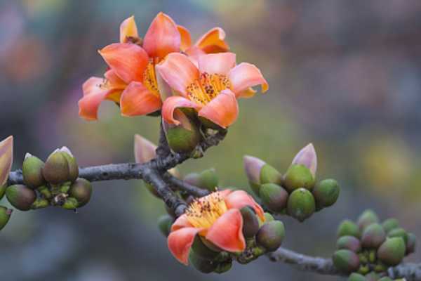 木棉通常是在每年是三月份到四月份之间开花的。花开的时候花色艳丽,多是红色。花朵单生在枝顶的叶腋处,花瓣呈肉质的。春天看上去满树的橙红色,很惹人喜爱。它四季会呈现不同的景象。春季开花,满树橙红,夏季长满叶子,绿树成荫。秋季枝条萧瑟,冬季落叶,光秃秃的树枝。
